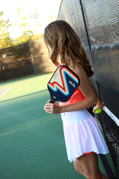 The Swifty Skirt combines classic tennis style with modern performance features. Its flowy white, and slightly translucent fabric offers freedom of movement, while built-in neon-colored shorts provide contrast and added coverage. Shorts include ball pockets; hem grips around the leg openings ensure the skirt stays in place during play; and the loose, comfortable waistband delivers flexible fit and feels appropriate to the light, flowy feel of the skirt. Ideal for athletes seeking both style and functionality on the court.